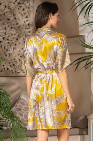 Оригинальный запашной короткий халат Mia-Amore с короткими рукавами выполнен из принтованного растительным узором искусственного шелка. Оригинальные рукава халата выполнены из принтованного мелкоузорчатым геометрическим паттерном искусственного шелка. Горловину халата украшает ассиметричный воротник по типу шальки, выполненный также из сочетания двух принтов.