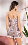 Комплект Mia-Amore состоит из топа на тонких бретелях и шорт, выполнен из принтованного смесового шелка. Верх топа и низ шорт декорированы ажурным кружевом. Декор - атласный бантик с подвеской по центру выреза топа.