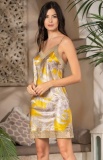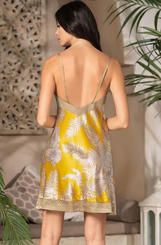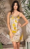 Короткая сорочка Mia-Amore без подреза на тонких бретелях выполнена из лимонного принтованного растительным узором искусственного шелка. Лиф и низ сорочки украшены отделкой с мелкоузорчатым геометрическим паттерном.